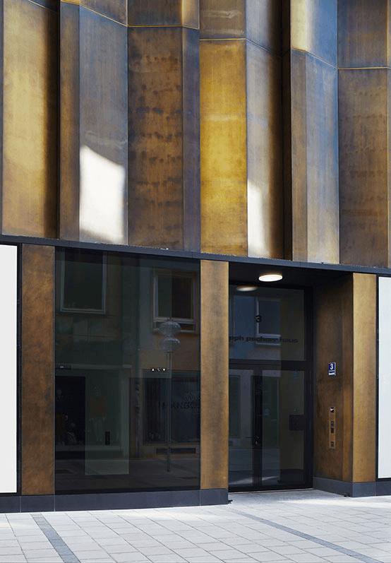 Im Herzen der Münchner Innenstadt, zwischen Stachus und Marienplatz, entstand mit dem Joseph-Pschorr-Haus ein architektonisch anspruchsvolles Mixed-Use-Gebäude mit Einzelhandel, Wohnen und Büros. Die klare, vertikal gegliederte Fassadengestaltung kombiniert Glas mit hochwertigen Messingelementen und verleiht dem Baukörper seine unverwechselbare Identität. In Zusammenarbeit mit Siedle war ZinCuTec an der Realisierung der Fassadenoberflächen aus brüniertem Messing beteiligt. Das Team verantwortete die Veredelung und Oberflächenbearbeitung der massiven Messingelemente. Durch sorgfältige Handarbeit und ein kontrolliertes Brünierverfahren erhielt das Metall eine edle, tiefbraune Oberfläche mit warmem Schimmer, die perfekt auf die Bronze-Glas-Fassade abgestimmt ist.